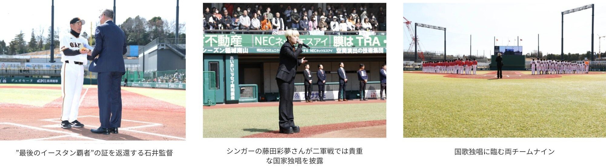 その後、両チームナインが整列する中、ジャイアンツ主催の二軍戦では珍しい国歌独唱が行われ、ライブ活動などで活躍するGタウン近隣在住のシンガー・藤田彩夢さんが「君が代」を歌い上げました。