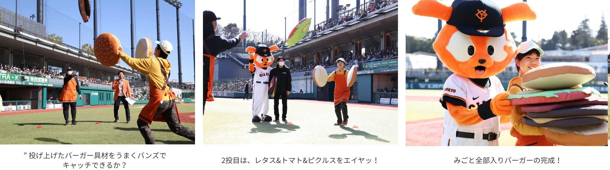 エキサイトシート観戦者がヒーロー選手とハイタッチを交わす「エキサイトハイファイブ」は、Gタウン開催の全試合が対象で、ジャイアンツ勝利時に実施します。「ヒーローズランウェイ」(勝利時)、「バーガーゲットチャレンジ」は土日祝日ゲーム限定です。