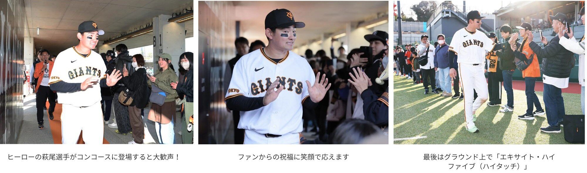 この日の試合は、新戦力も含めた打線が大爆発してジャイアンツが18-5で勝利。3安打4打点と大暴れの萩尾匡也選手が今年最初のヒーローに選ばれました。今シーズンの新たな試み、ヒーロー選手が場内コンコースを歩いてファンの祝福を受ける「ヒーローズランウェイ」も、さっそく開幕戦から実現。一軍戦も含めてプロ野球界では類を見ない、ヒーロー選手の観客エリアへの登場とあって、オレンジカーペット上を凱旋する萩尾選手には、通路を埋めたファンから「おめでとう!」「次もがんばって!」などと声がかけられていました。 このあと、客席からグラウンドに降りた萩尾選手は、エキサイトシート観戦者から抽選で選ばれた約100人にハイタッチで出迎えられ、開幕戦の勝利と大活躍の喜びを分かち合っていました。