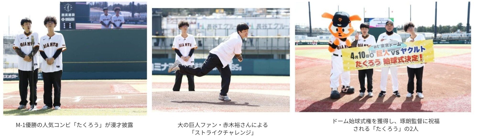 試合に先立ち、グラウンドに登場したのは、M-1グランプリ2025のチャンピオンに輝いた人気お笑いコンビ「たくろう」の2人。今季から石井琢朗(たくろう)監督が二軍の指揮を執ることもあり、出演が実現しました。野球とボクシングを掛け合わせたネタで軽妙な漫才を披露したのち、大の巨人ファンというボケ役の赤木裕さんが、東京ドームでの始球式実施権をかけた「ストライクチャレンジ」に挑みました。キャッチャー・坂本達也選手、バッター・竹下徠空選手に対して投じた1球は見事見逃しストライクとなり、4月10日の巨人―ヤクルト戦(東京ドーム)で始球式に臨むことが決定。琢朗監督からたくろうの2人に記念のボードが贈られ、大きな拍手を浴びていました。