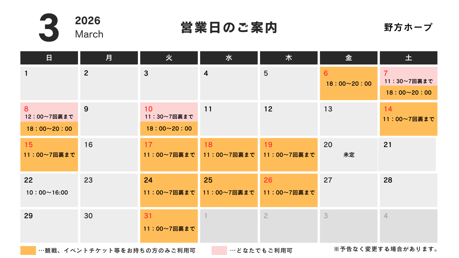 | 定休⽇ | 試合・イベント日程に準ずる。上部カレンダーをご確認ください。 |